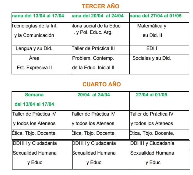 A partir de la disposición N°1 /2020 de Dirección del 2 de abril, se elaboró un cronograma de desarrollo académico por la emergencia sanitaria por todos sabida, plausible de cambios sobre la marcha, de acuerdo a lo que experimentaremos a partir de esta semana, que ha sufrido demoras en su inicio, debido a la gran cantidad de estudiantes que posee nuestro profesorado (590 alumnos).