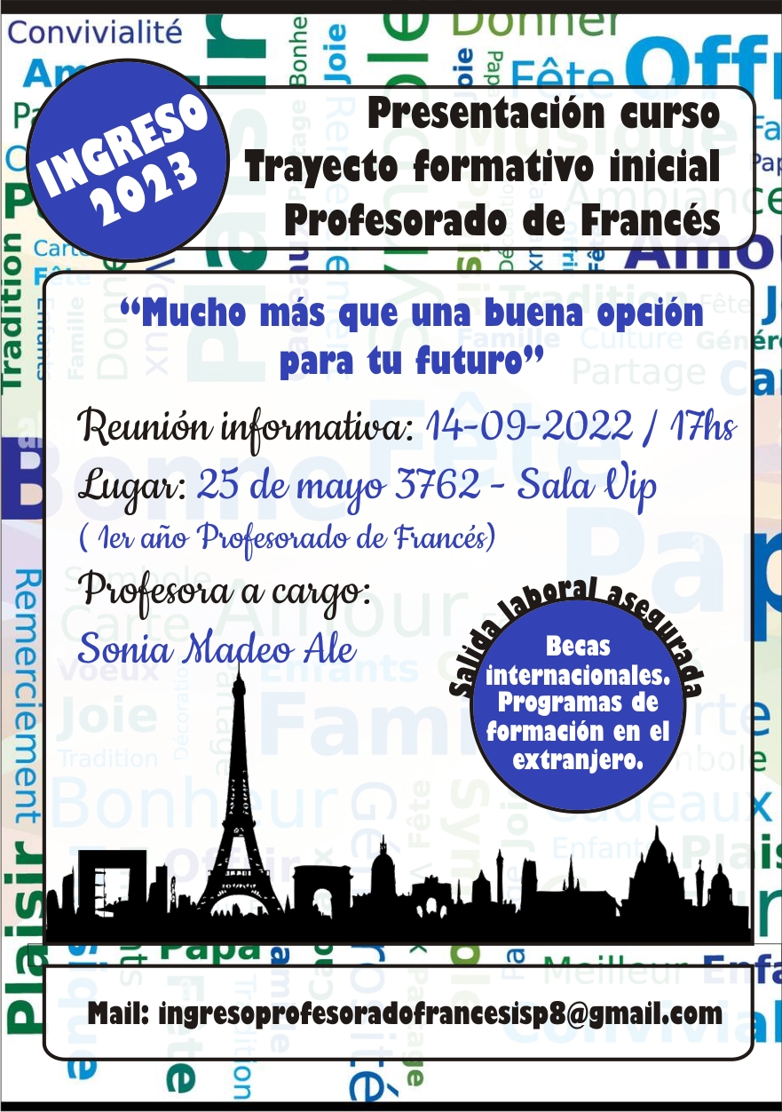 El próximo 14 de septiembre a las 17 hs. se ofrecerá una charla informativa sobre el curso de ingreso al Profesorado de Francés 2023. ¡Los esperamos!