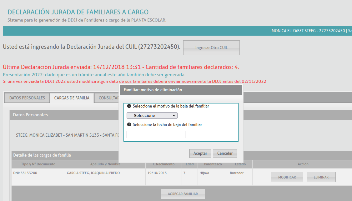 MODIFICACION EN LA DDJJ DE FAMILIAR A CARGO