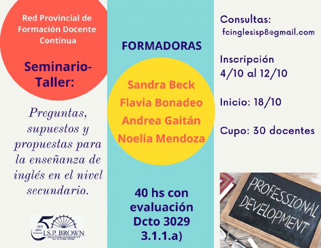 Recordamos que el próximo lunes 18 de octubre dará comienzo el cursado del Seminario-Taller Preguntas, supuestas y propuestas para la enseñanza de inglés en el nivel secundario.