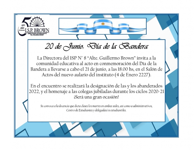 La Dirección del Instituto Superior de Profesorado Nº 8 tiene el agrado de invitarlo/s a usted/es a participar del Acto del Día de la Bandera en conmemoración del fallecimiento de su creador Manuel Belgrano, el día 21 de junio a las 18 horas en el Aulario del ISP8, sito en 4 de enero 2227.